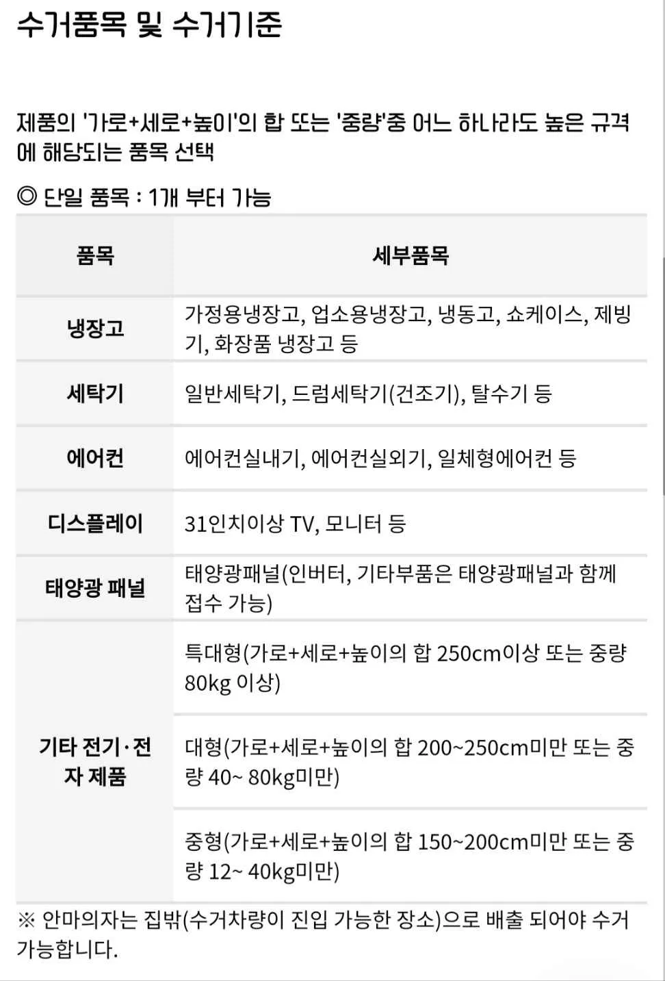 단일 수거 가능 품목 냉장고(가정용/업소용/김치냉장고/쇼케이스), 세탁기(드럼/일반), 에어컨(실내기/실외기), TV(모니터 포함)